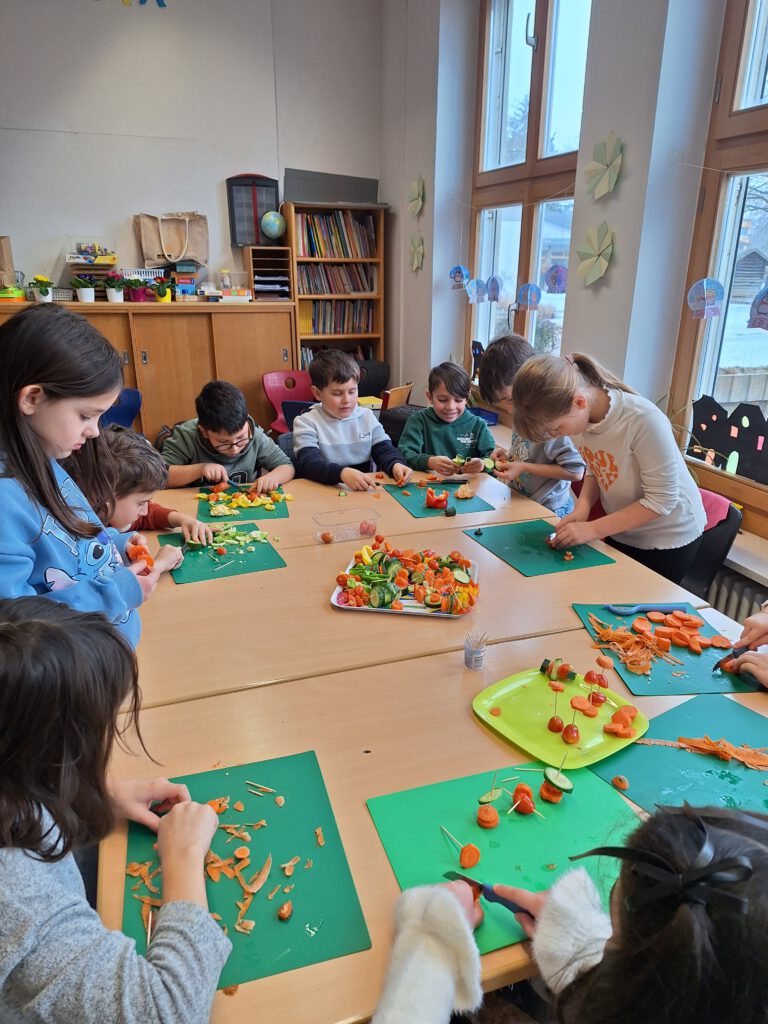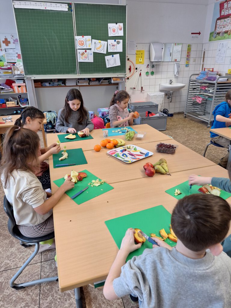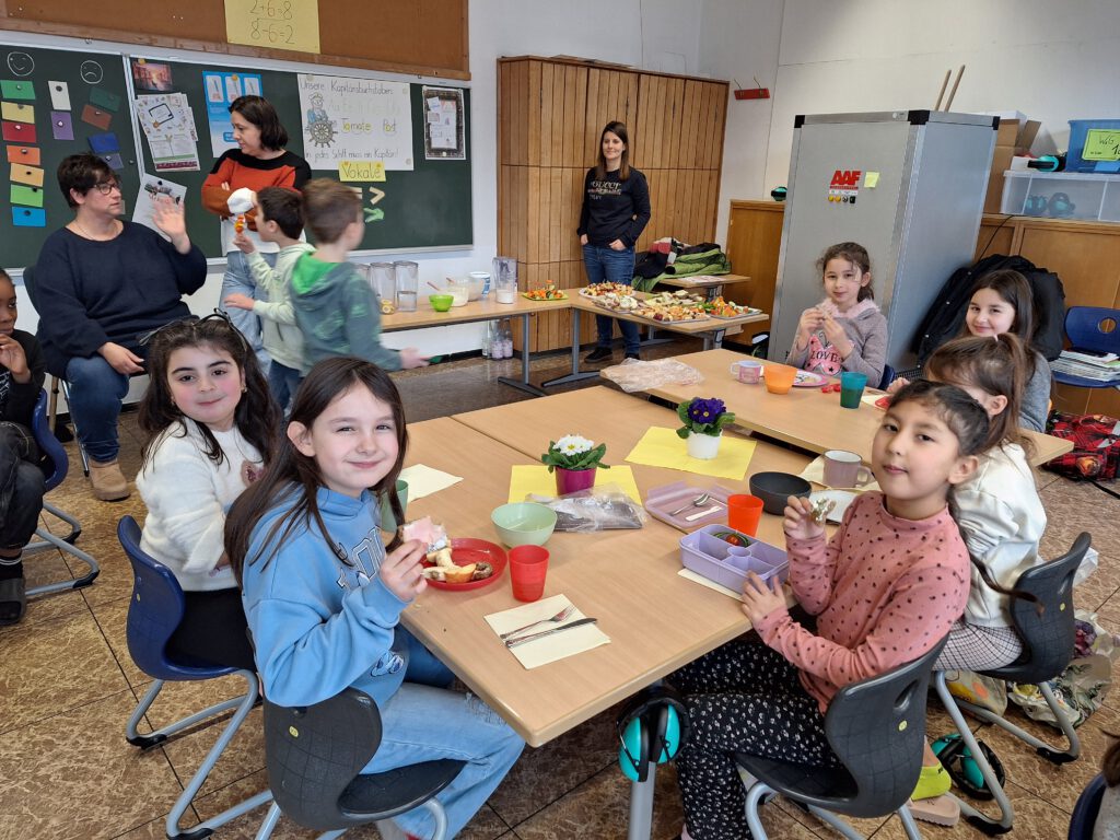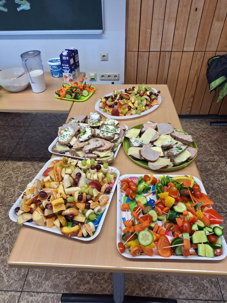 Die Klasse 2a beteiligte sich am Projekt „Essen mit Köpfchen“ des Gesundheitsamtes. Schon in der 1. Klasse bekamen die Kinder mehrmals Post vom „Essen mit Köpfchen“-Team mit leckeren und gesunden Rezepten zu den verschiedenen Jahreszeiten. Jetzt besuchte Frau Weichselgartner die Klasse. Zuerst beurteilten die Kinder an mehreren Beispielen, ob ein Frühstück gesund oder weniger gesund ist. Dann durften die Jungen und Mädchen die zahlreichen Produkte auf dem Lebensmitteltisch in die drei Kategorien gesund, mittel und ungesund einsortieren. Anschließend ging es endlich mit der Zubereitung der Speisen los. In Gruppen mischten die Kinder gesunde Getränke, bereiteten bunte Brote und fantasievolle Obst- und Gemüsespieße zu. Alle konnten es kaum erwarten, bis das appetitliche Buffet eröffnet wurde und sich jeder nach Herzenslust bedienen konnte. Am Ende waren sich alle einig, dass das gemeinsame Vorbereiten ebenso viel Spaß gemacht hatte wie das Verzehren des leckeren Essens.