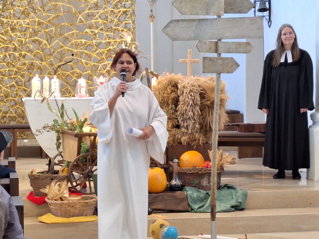 Mittlerweile hat es sich zu einer Tradition entwickelt, dass die vier Altmühldorfer Klassen ihren Anfangsgottesdienst ein paar Wochen nach Schulbeginn in der zum Erntedankfest prächtig geschmückten Pfarrkirche St. Laurentius in Altmühldorf feiern. Frau Stadler und Frau Leonhardt zelebrierten gemeinsam eine kurzweilige Andacht, bei der ein Wegweiser im Mittelpunkt stand. Dieser war ein Symbol für den Weg, den wir im neuen Schuljahr gemeinsam gehen, mit allen Hindernissen, Umwegen und auch schönen Strecken. Kinder und Lehrer lasen die Kyrierufe, die Lesung und Fürbitten vor. Und natürlich durften auch von Frau Stadler an der Gitarre begleitete Lieder nicht fehlen. Mit der Jahreshausaufgabe, Stationen unseres Weges auf einem Plakat festzuhalten, machten sich alle auf den Weg zurück zum Schulhaus. Diesen Moment erwarteten die Kinder der Kinderwelt St. Laurentius, die mit ihren Betreuern ebenfalls anwesend waren, schon sehnsüchtig. Sie dürfen dann nämlich jedes Jahr den Erntealtar plündern und sich das leckere Obst und Gemüse schmecken lassen.