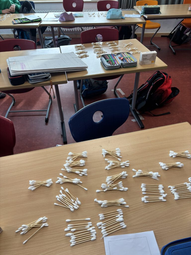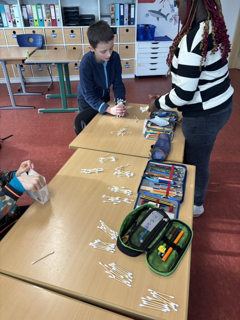 In der Klasse 3g haben wir uns mit dem Zahlenraum 1000 beschäftigt – und dabei richtig viel ausprobiert. Zuerst haben wir gemeinsam 1000 Wattestäbchen gezählt. Damit es einfacher geht, haben wir immer 10 Stück zu einem Bündel zusammengefasst. So konnten wir gut sehen, wie viele es schon sind – und wie viele noch fehlen.