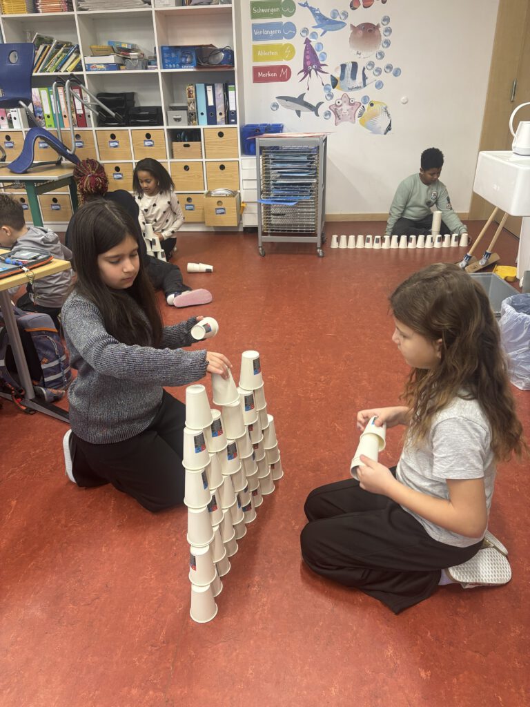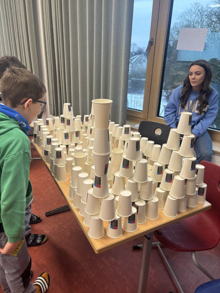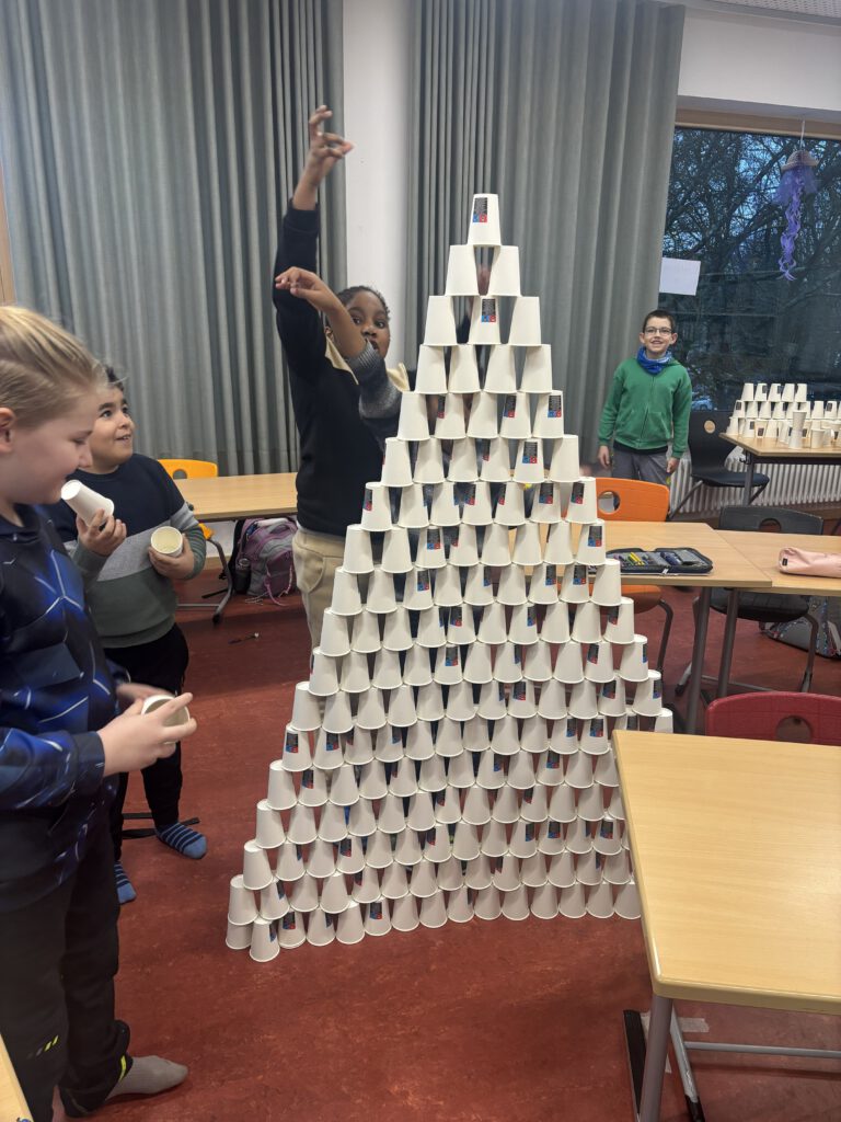 Am meisten Spaß hat uns aber das Bauen mit 1000 Bechern gemacht. Wir haben große Türme gebaut und dabei zusammengearbeitet. Manche Türme waren besonders hoch, andere sind zwischendurch auch umgefallen – das war lustig!