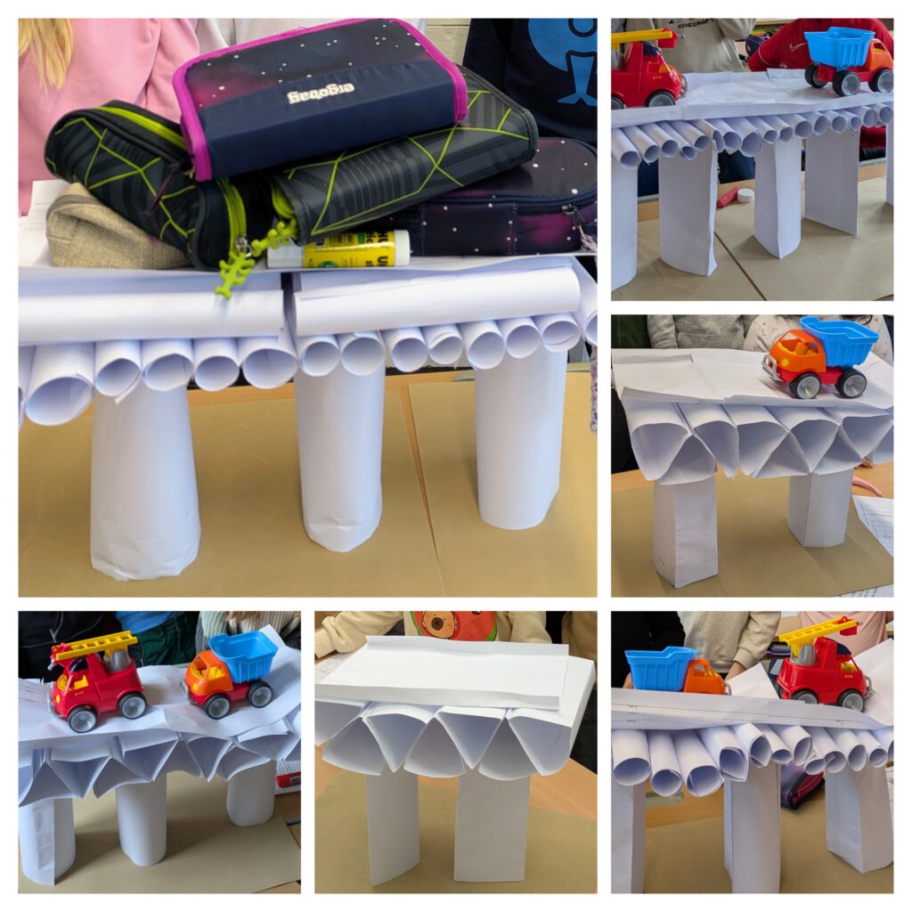 Durch das Umformen des Papiers lernten die Kinder die Stabilität zu erhöhen. Eifrig testeten sie, welche Brücke die höchste Tragkraft hat.