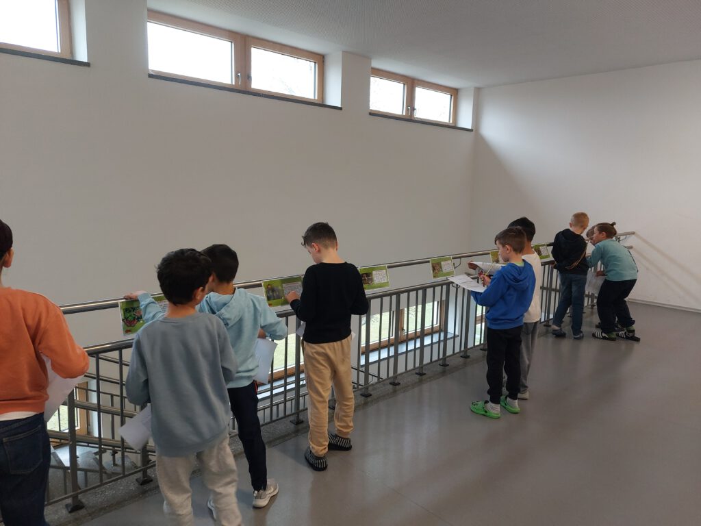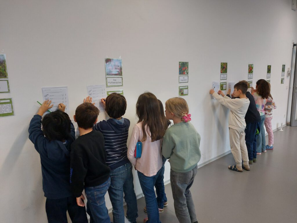Die Klasse 2c hat sich in den letzten Wochen mit der Hecke beschäftigt, einem ganz besonderen Lebensraum für viele Tiere und Pflanzen. Damit alle Kinder selbstständig und in ihrem eigenen Tempo lernen konnten, wurden verschiedene Stationen vorbereitet. Es gab viel zu entdecken: Am Geländer hingen bunte Informationskarten zu den Tieren, die in der Hecke wohnen. An der Wand fanden sich weitere Karten, diesmal zu den verschiedenen Heckenpflanzen wie Hagebutte oder Holunder.