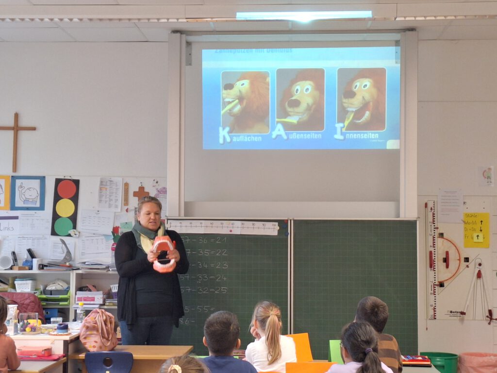 Seit diesem Jahr ist Frau Dr. Riedel als Schulzahnärztin für Altmühldorf zuständig. Obwohl die Kinder ja schon vieles über Zahnpflege wissen, schadet ein regelmäßiges „Update“ nicht. Deshalb wiederholte Frau Dr. Riedel in allen vier Klassen die wichtigsten Zahnputzregeln und verdeutlichte anhand von kleinen Experimenten, wie Zucker und Säuren unsere Zähne angreifen und was wir dagegen tun können. Und da Zahnpflegeutensilien ja regelmäßig erneuert werden müssen, bekam jedes Kind Zahnpasta, eine Zahnbürste, eine Infobroschüre, Färbetabletten und auch noch einen Spitzer geschenkt.