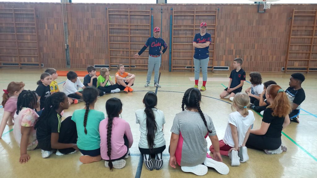 Baseball kennt man als amerikanische Sportart aus dem Fernsehen. Doch dass es auch beim TSV 1860 Mühldorf eine Baseballabteilung gibt, ist vielen nicht bekannt. Deshalb kamen Ariane und Kür-Sad von den Mühldorf Cubs an die Grundschule und alle 2., 3. und 4. Klassen durften eine Doppelstunde lang Baseballluft schnuppern. Dabei stellten die Kinder fest, dass es gar nicht so leicht ist, den Ball mit dem Schläger zu treffen oder ihn schnellstmöglich zurück zur Homebase zu bringen. Auch die Regeln sind anfangs etwas verwirrend, aber nach einiger Zeit schafften die Klassen schon gute Spielzüge. Wer sich Baseball noch genauer anschauen möchte, darf gerne bei den Mühldorf Cubs zum Probetraining vorbeikommen.